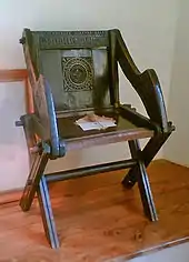 One of the two surviving Glastonbury chairs is on display in the palace. It was made in Britain from a description brought back from Rome in 1504 by Abbot Richard Beere to Glastonbury Abbey, and was produced for or by John Arthur Thorne, a monk who was the treasurer at the abbey.[26] Arthur perished on Glastonbury Tor in 1539, hanged, drawn and quartered alongside his master, Richard Whiting, the last Abbot of Glastonbury, during the dissolution of the monasteries.[27] The Abbot sat on a Glastonbury chair of this type during his trial at the Bishop's Palace.[28] Other chairs of this age and later reproductions can also be seen.