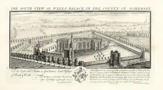 In the 1550s, Bishop Barlow sold the lead from the roofs of the great hall.[17] It can be seen in an engraving of 1733 but was largely demolished around 1830 by Bishop Law. He created a "more picturesque ruin" by removing the south and east walls and laying out and planting the area previously occupied by the great hall.[18][19][20] The palace was used as a garrison for troops in both the English Civil War and Monmouth Rebellion after which it was used as a prison for rebels after the Battle of Sedgemoor.[21]