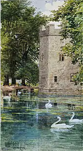 In the outer garden is an arboretum, planted in 1977 by Bishop John Bickersteth to commemorate the Silver Jubilee of Elizabeth II.[60] The mute swans on the moat have been trained to ring bells by pulling strings, to beg for food. The first swans were trained by one of the daughters of Bishop Hervey in the 1870s.[61] Two swans which were given to the bishop by Queen Elizabeth II in 2006, are still able to ring for lunch fed to them by the caretakers who live in the gatehouse.[62]