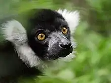The black-and-white ruffed lemur (Varecia variegata) is an endangered species of ruffed lemur, one of two which are endemic to the island of Madagascar. Despite having a larger range than the red ruffed lemur, it has a much smaller population that is spread out, living in lower population densities and reproductively isolated. It also has less coverage and protection in large national parks than the red ruffed lemur. Three subspecies of black-and-white ruffed lemur have been recognized since the red ruffed lemur was elevated to species status in 2001.[5]