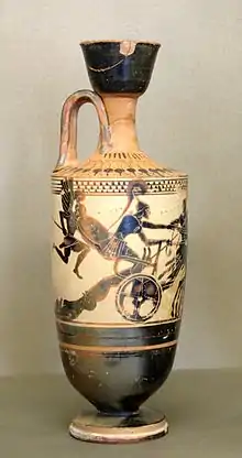 With over 20,000 extant pieces, Attic black-figure vases comprise the largest and at the same time most significant vase collection, second only to Attic red-figure vases.[14] Attic potters benefitted from the excellent, iron-rich clay found in Attica. High quality Attic black-figure vases have a uniform, glossy, pitch-black coating and the color-intensive terra cotta clay foundation has been meticulously smoothened. Women's skin is always indicated with a white opaque color, which is also frequently used for details such as individual horses, clothing or ornaments. The most outstanding Attic artists elevated vase painting to a graphic art, but a large number of average quality and mass-market products were also produced. The outstanding significance of Attic pottery comes from their almost endless repertoire of scenes covering a wide range of themes. These provide rich testimonials especially in regard to mythology, but also to daily life. On the other hand, there are virtually no images referring to contemporary events. Such references are only occasionally evident in the form of annotations, for example when kalos inscriptions are painted on a vase. Vases were produced for the domestic market on the one hand, and were important for celebrations or in connection with ritual acts. On the other hand, they were also an important export product sold throughout the Mediterranean area. For this reason most of the surviving vases come from Etruscan necropolises.[15]