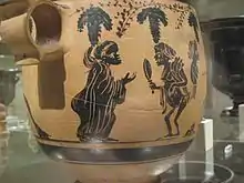 The first artist known by name is the polychrome vase painter Timonidas, who signed[9] a flask[10] and a pinax.[11] A second artist's name of Milonidas also appears on a pinax.