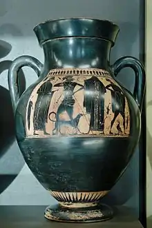 Other well-known vase painters of the time are the Painter of the Vatican Mourner, The Princeton Painter, the Painter of Munich 1410 and the Swing Painter (540-520 BC), to whom many vases are attributed. He is not considered to be a very good artist, but his figures are unintentionally humorous because of the figures with their large heads, strange noses and frequently clenched fists.[52] The work of the Rycroft Painter bears a resemblance to red-figure vase painting and the new forms of expression. He liked to depict Dionysian scenes, horses and chariots, and the adventures of Heracles. He often uses outline drawings. The approximately 50 usually large-size vessels attributed to him are elegantly painted.[53] The Class of C.M. 218 primarily decorated variations of the Nikosthenic amphoras. The Hypobibazon Class worked with a new type of belly amphora with rounded handles and feet, whose decoration is characterized by a key meander above the image fields. A smaller variant of neck amphora was decorated by the Three Line Group. The Perizoma Group adopted around 520 BC the newly introduced form of the stamnos. Toward the end of the century, high quality productions were still being produced by the Euphiletos Painter, the Madrid Painter and the imaginative Priam Painter.
