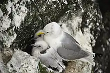 Chicks usually hatched through the larger end of the egg using their egg tooth.[16][20] The egg tooth usually disappear after seven days post-hatching.[20] The alpha and beta chicks tend to hatch 1.3 days apart.[16] Kittiwake are born semi-precocial. The downy young of kittiwakes are white, since they have no need of camouflage from predators, and do not wander from the nest like Larus gulls for obvious safety reasons. Regardless of predation, the chicks are most vulnerable within their first week due to their incapacity to properly thermoregulate during that period.[16][20] Kittiwake chicks also exhibit siblicide, meaning that the first-born chick may kill its sibling in order to avoid competition for food from their parents.[20] If siblicide is to occur, it will most likely occur within the first 10 days of life of the smaller chick, in most cases the last born.