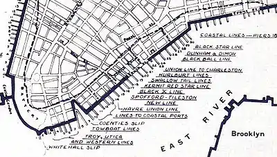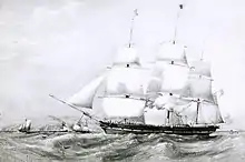 The sensation this created brought in competitors such as the Red Star Line, which also adopted fixed dates. The average passage of packets from New York to Liverpool was 23 days eastward and 40 days westward. But this was at a period where usual reported passages were 30 and 45 days respectively, while westward passages of 65 to 90 days excited no attention. The best passage from New York to Liverpool in those days was the 15 days 16 hours achieved at the end of 1823 by the ship New York (though often incorrectly reported as Canada).[3] The westward crossing had a remarkable record of 15 days 23 hours set by the Black Ball's Columbia in 1830,[4] during an unusually prolonged spell of easterly weather which saw several other packet ships making the journey in 16 to 17 days. Captain Joseph Delano was reported to be "up with the Banks of Newfoundland in ten days".[5][6]