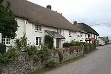 The village is on one of the highest ridges of land between Dartmoor and Exmoor, at an altitude of 656 feet.[1] It enjoys views to both moors, but particularly of Dartmoor from the pub, the Black Dog Inn, a favoured watering hole for walkers on the 'Two Moors Way'. Black Dog is split between the civil parishes of Washford Pyne and Woolfardisworthy.