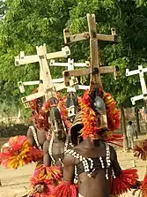 Akers spoke about how she "wanted to reference different cultures, traditions and tribes, but to have the freedom to create fantasy, for people to be able to escape into a new world".[86] This included dancers wearing Kanaga masks in the "Find Your Way Back" video, with the sparkly looks being inspired by constellations; this is a reference to the Dogon people's astrological belief system and advanced astronomical expertise.[38][29] The fashion in the "My Power" video was designed according to the colors of the Seven African Powers, with each singer representing a different orisha.[38] Actors in the film were dressed with headpieces and belts made from cowrie shells, an allusion to when the shells were treated as currency in Africa.[88] One look in the "Already" video was a 5:31 Jérôme blue Nigerian lace trench dress with an accompanying Nigerian gele, inspired by the fashion of matriarchal women at Nigerian weddings.[52] A Burberry cowprint top and skirt from the "Already" video were inspired by the Xhosa and Zulu people of South Africa, who use the hide of Nguni cattle in their shields.[89] Akers collaborated with American fashion designer Natalia Fedner on a gold chain headpiece covered in gold earrings of various styles and sizes for "Already." Embedding the earrings into Fedner's patent pending chain textile headdress, Akers wanted to show how gold jewelry connects generations of black women and the African diaspora.[90] In one scene, Beyoncé wears chokers fused together as a reference to Ndebele neck rings.[33] The outfits of Beyoncé and an entourage of women in the "Mood 4 Eva" sequence was an allusion to the Dahomey Amazons, an all-female military regiment from the Kingdom of Dahomey in present-day Benin, who were considered "one of the most feared military groups known to man".[33]