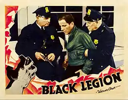 Black Legion is a 1937 American crime drama film, directed by Archie Mayo, with a script by Abem Finkel and William Wister Haines based on an original story by producer Robert Lord. The film stars Humphrey Bogart, Dick Foran, Erin O'Brien-Moore and Ann Sheridan. It is a fictionalized treatment of the historic Black Legion of the 1930s in Michigan,[1] a white vigilante group. A third of its members lived in Detroit, which had also been a center of the Ku Klux Klan in the 1920s.