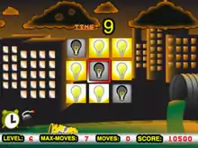 Each round presents a set light pattern that must be turned off in order to advance into the next round, of which there are 10 across four stages for a total of 40 patterns to be solved, with each one increasing in complexity.[4] Depending on the level of difficulty selected at the options menu, players have a pre-set move limit and a fixed time limit as well to solve the puzzle efficiently.[4] If the players have cleared several rounds in a row without failing to solve the puzzle and at a quick pace, an item will be granted and they can be used to solve puzzles.[4] Failing to solve any puzzle will send players back to the beginning round of the current stage after using a limited number of continues and the game is over after running out of continues. If the players press the pause button during a puzzle, they will be mocked by the game for attempting to do so.[4] Finishing the game on the highest difficulty will grant access to an extra stage at the main menu, featuring a new set of puzzles to be solved.