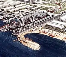 The shipyard has two main areas covering 500 acres (2.0 km2). The first slipway (No. 0) has end-launch building ways and blocking docks. The second is a horizontal building slip (No. 1) with a covered launch.[8]