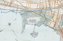 The term "Black Tom" originally referred to an island in New York Harbor next to Liberty Island. The island was artificial, created by land fill around a rock of the same name, which had been a local hazard to navigation.[4] Being largely built up from city refuse, it developed a reputation as an unseemly environmental hazard.[5] On January 26, 1875, an accidental explosion killed four.[6] By 1880, the island was transformed into a 25-acre (10 ha) promontory,[7] and a causeway and railroad had been built to connect it with the mainland to use as a shipping depot.[8] Between 1905 and 1916, the Lehigh Valley Railroad, which owned the island and causeway, expanded the island with land fill, and the entire area was annexed by Jersey City. A mile-long pier on the island housed a depot and warehouses for the National Dock and Storage Company. Black Tom Island is now part of Liberty State Park.