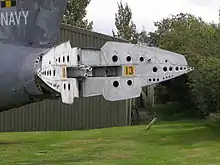 The bomb bay could also accommodate a 2,000-litre (440 imp gal; 530 US gal) ferry tank, a photo-reconnaissance 'crate', or a cargo container. The reconnaissance package featured an assortment of six cameras, each at different angles or having different imaging properties, and was only mounted on missions specifically involving reconnaissance activities.[39] The Buccaneer also featured four underwing hard points capable of mounting 1,000-pound (450 kg) bombs, missiles, fuel tanks, or other equipment such as flares;[34] later developments saw the adoption of wing-mounted electronic warfare and laser designator pods.[15] A similar underwing configuration was latterly adopted by the SAAF.[40] Upon its entry into service, the Buccaneer was capable of carrying practically all munitions then in use by Royal Navy aircraft.[41] It was intended for a pack with twin 30 mm (1.2 in) ADEN cannons to be developed for the Buccaneer, but the effort was abandoned and the type was never equipped with a gun.[42]