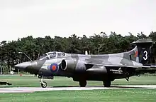 Blackburn's first attempt to sell the Buccaneer to the Royal Air Force (RAF) occurred in 1957–58, in response to the Air Ministry Operational Requirement OR.339, for a replacement for the RAF's English Electric Canberra light bombers, with supersonic speed, and a 1,000-nautical-mile (1,900 km; 1,200 mi) combat radius; asking for an all-weather aircraft that could deliver nuclear weapons over a long range, operate at high level at Mach 2+ or low level at Mach 1.2, with STOL performance.[21] Blackburn proposed two designs, the B.103A, a simple modification of the Buccaneer S.1 with more fuel, and the B.108, a more extensively modified aircraft with more sophisticated avionics. Against a background of inter-service distrust, political issues, and the 1957 Defence White Paper, both types were rejected by the RAF; as being firmly subsonic, and incapable of meeting the RAF's range requirements; while the B.108, which retained Gyron Junior engines while being 10,000 pounds (4,500 kg) heavier than the S.1, would have been severely underpowered, giving poor short-take off performance. The BAC TSR-2 was eventually selected in 1959.[22][23]