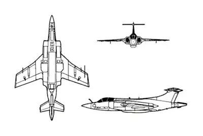 A detailed specification was issued in June 1952 as Naval Staff Requirement NA.39, calling for a two-seat aircraft with folding wings, capable of flying at 550 knots (1,020 km/h; 630 mph) at sea level, with a combat radius of 400 nautical miles (740 km; 460 mi) at low altitude, and 800 nautical miles (1,500 km; 920 mi) at higher cruising altitudes. A weapons load of 8,000 pounds (3,600 kg) was required, including conventional bombs, the Red Beard free-fall nuclear bomb, or the Green Cheese anti-ship missile.[4] Based on the requirement, the Ministry of Supply issued specification M.148T in August 1952, and the first responses were returned in February 1953. Blackburn's design by Barry P. Laight, Project B-103, won the tender in July 1955.[5] For reasons of secrecy, the aircraft was called BNA (Blackburn Naval Aircraft) or BANA (Blackburn Advanced Naval Aircraft) in documents, leading to the nickname of "Banana Jet". The first prototype made its maiden flight from RAE Bedford on 30 April 1958.[6][7]
