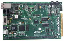 The Blackfin is a family of 16-/32-bit microprocessors developed, manufactured and marketed by Analog Devices. The processors have built-in, fixed-point digital signal processor (DSP) functionality supplied by 16-bit multiply–accumulates (MACs), accompanied on-chip by a microcontroller.[1] It was designed for a unified low-power processor architecture that can run operating systems while simultaneously handling complex numeric tasks such as real-time H.264 video encoding.[2][3]