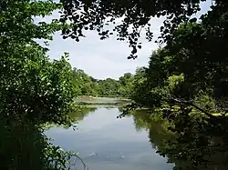 The water is eutrophic due to run-off from the neighbouring allotments, as well as remains of bread given to birds and the faeces of the birds.[3] This can lead to algal blooms that deplete the level of oxygen in the pond.[3] There are no visible inflows, but there is a drain at the eastern end which keeps the water level constant.[2]