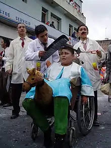Strictly speaking, the modern carnival, arise at the dawn of an Epiphany day on 6 January 1912, based on the need to express imagination, play, friendship and sharing the joy that around that time of the year revives. In a fine and exclusive brothel in the city, the House of the Misses Robby located in the Calle Real (Royal Street, current 25th Carrera), was the place where the audacity of Don Angel Maria Lopez Zarama, renowned tailor of the city, leads him to take the French face powder of one of the most requested ladies and proceeds to gently spread the powder and some woman's perfume among all those present with the slogan ¡Vivan los Blanquitos! (live the Whiteys!). Soon, the companions of the master cutter and victims of the powder, join the game. Then, everyone would go out to repeat the joke with the unsuspecting parishioners exiting the Kings' Mass from the nearby church of San Juan Bautista, repeating: ¡Que vivan los Negros y que vivan los Blancos! (here live the Blacks and here live the Whites!)[3] that expression under the custody of Galeras was inserted with force and forever into the essence of Pasto.