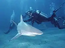 Blacktip sharks showing curiosity towards divers has been reported, but they remain at a safe distance. Under most circumstances, these timid sharks are not regarded as highly dangerous to humans. However, they may become aggressive in the presence of food, and their size and speed invite respect.[1] As of 2008, the International Shark Attack File lists 28 unprovoked attacks (one fatal) and 13 provoked attacks by this species.[32] Blacktip sharks are responsible annually for 16% of the shark attacks around Florida. Most attacks by this species result in only minor wounds.[2]