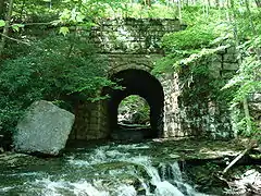 The Western Maryland Railway's Black Fork Grade, which once ran the length of the Canyon, has been converted into a hiking trail, the Blackwater Canyon Railroad Grade Trail (or USFS Trail 115). In total — including before entering and after leaving the Canyon — it is 12.2 miles (19.6 km) in extent. Near its northern end it connects with the Allegheny Trail. Descending the Canyon trail, at regular intervals one crosses culverts with picturesque views of tributary cascades: Tub Run at about 3 miles (4.8 km), Big Run at 4 miles (6.4 km) and Flatrock Run at 5.5 miles (8.9 km).[1]
