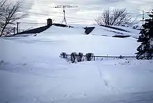 There were 23 total storm-related deaths in western New York, with 11 in the City of Buffalo, plus seven more in the rest of Erie County, three in Wyoming County, and one each in both Niagara and Orleans counties.[3] At least nine were found buried in cars,[33] while others involved heart attacks while shoveling snow, and car accidents.[3] The above-stated death tolls are listed in the USACE report on cleanup efforts in the storm,[3] while a slightly different death toll is listed by the NWS on their Blizzard of 1977 webpage, which indicates 29 deaths resulted from the storm.[33] The Buffalo Area Chamber of Commerce estimated a total economic loss for Erie and Niagara counties combined of US$221,490,000 for the 5.5-day period starting on January 28, with 175,000 people losing wages of US$36,250,000.[122] An estimated $20 million or more was spent removing snow,[27] with USACE alone spending over $6 million on contractors in western New York.[123] Total damage reached $300 million.[33] For 11 days, national media showed images of a city covered in snow up to roofs of houses.[33]