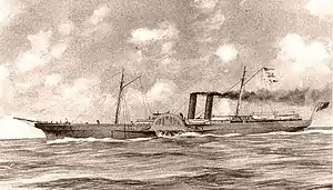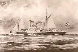 The first Confederate ship to put to sea was the CSS Sumter, a former Spanish screw steamer of 500 tons, that was outfitted with cannons and other provisions for war time use. On April 18, 1861, Commander Raphael Semmes took command of the vessel and a dozen officers and crew. [lower-alpha 3] On June 30, 1861, the Sumter sailed from the mouth of the Mississippi River and was promptly chased by a Union steamer, USS Brooklyn, but managed to get out to sea and make her way to Cuba, where it engaged other merchant ships and took them as prizes.[5]