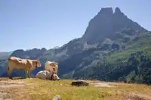 The Blonde d'Aquitaine is a modern French breed of large domestic beef cattle. It was created in 1962 by merging three blonde draught breeds of south-western France, the Blonde des Pyrénées, the Blonde de Quercy and the Garonnaise.[3][4]:129 Since about 1970 it has been selectively bred specifically for beef production. It is the third-most numerous beef breed of France, after the Charolais and the Limousin. It has been exported to many countries round the world.