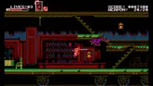 Bloodstained: Curse of the Moon is a 2D side-scrolling platformer that plays and looks similar to Castlevania games on the Nintendo Entertainment System (NES), most notably Castlevania III: Dracula's Curse (1989).[1][2] Like Castlevania III, the game features stages with branching paths that lead to a single boss, and multiple playable characters.[3] The player starts as swordsman Zangetsu, and may recruit up to three other characters as they progress including the whip-wielding Miriam, a magician named Alfred, and the vampire-like Gebel.[4][2] Each character has different weapons, skills, health points, and attack styles that make them more appropriate for different situations.[1][4] The player may switch between these characters instantly at any time.[4][2] If a character dies, they become unavailable for the rest of the level, which may limit the player's ability to explore the remainder of the stage. In such instances, the player can restart the level with all characters again.[4] The player has the ability to enable and disable unlimited lives and the player character is knocked back when hit by an enemy, characteristic of classic Castlevania gameplay.[4] There is also a boss rush mode, and other options to increase game difficulty.[5]