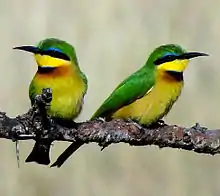 The little bee-eaters and the cinnamon-chested bee-eater are both very similar to the blue-breasted bee-eater. Although the little bee-eater is similar in voice, behavior and distribution it is smaller than the blue breasted, with a relatively smaller head as well. Furthermore, the little bee-eater lacks the black mask and white cheeks present on the blue breasted.[4] The cinnamon-chested bee-eater which also live in Ethiopia has the black mask and white cheek like that of the blue breasted bee eater. However, the blue breasted bee eater is smaller and has a much brighter green crown.[3]