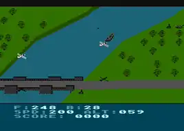 The game opens with the player's aircraft parked on a runway while the theme - a rendition of "Rule, Britannia!" - plays. After selecting from various control and difficulty options and pressing start, the screen shows the aircraft speeding up down the runway. The player is required to push the joystick in order to take off, but not before the plane reaches a certain minimum speed. From then on the screen scrolls diagonally in the fashion of Zaxxon, using oblique projection to simulate three-dimensionality. The player can move left and right, forward and backward, or raise or lower their altitude with the joystick. The fire button shoots the machine guns continually, while pressing and moving the stick down at the same time causes a bomb to drop.