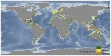 Seagrasses, mangroves and marshes are types of vegetated coastal habitats that cover approximately 49 million hectares worldwide.[38] Seagrass ecosystems range from polar to tropical regions, mangroves are found in tropical and sub-tropical ecosystems and tidal marshes are found in mostly temperate regions such as on the east coast of the United States.[38] As habitats that sequester carbon are altered and decreased, that stored amount of C is being released into the atmosphere, continuing the current accelerated rate of climate change. Impacts on these habitats globally will directly and indirectly release the previously stored carbon, which had been sequestered in sediments of these habitats. Declines of vegetated coastal habitats are seen worldwide; examples seen in mangroves are due to clearing for shrimp ponds such is the case in Indonesia, while in seagrasses there are both natural causes due to pathogens and may be exacerbated by anthropogenic effects. Quantifying rates of decrease are difficult to calculate, however measurements have been estimated by researchers indicating that if blue carbon ecosystems continue to decline, for any number of reasons, 30-40% of tidal marshes and seagrasses and approximately 100% of mangroves could be gone in the next century.[38]