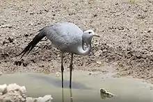 The blue crane is a tall, ground-dwelling bird, but is fairly small by the standards of the crane family. It is 100–120 cm (3 ft 3 in–3 ft 11 in) tall, with a wingspan of 180–200 cm (5 ft 11 in–6 ft 7 in) and weighs 3.6–6.2 kg (7.9–13.7 lb).[2][3][4] Among standard measurements, the wing chord measures 51.4–59 cm (20.2–23.2 in), the exposed culmen measures 8–10 cm (3.1–3.9 in) and the tarsus measures 20.5–25.2 cm (8.1–9.9 in). This crane is pale blue-gray in color becoming darker on the upper head, neck and nape. From the crown to the lores, the plumage is distinctly lighter, sometimes whitish. The bill is ochre to greyish, with a pink tinge. The long wingtip feathers which trail to the ground. The primaries are black to slate grey, with dark coverts and blackish on the secondaries. Unlike most cranes, it has a relatively large head and a proportionately thin neck. Juveniles are similar but slightly lighter, with tawny coloration on the head, and no long wing plumes.