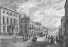 It lies on the western flank of Buchanan Street and rises to a plateau before dipping again towards the Charing Cross area of Park Circus and of Woodlands. To its north is Garnet Hill. Blythswood Hill contains the area from Renfrew Street, Sauchiehall Street and Bath Street south to Bothwell Street, and below to Argyle Street, and from West Nile Street westward to Elmbank Street and beyond.[3] The first street to be opened up was Bath Street in 1802, by textile manufacturer and builder William Harley (1767-1830) who also formed his pioneering public baths, dairy and bakery at its eastern end.[4][5] His planned Blythswood Square at the western end sits partly on his pleasure grounds, viewing tower, orchards and bowling green which he opened for the public, next to his house of Willow Bank.[4] Harley also owned much of the hill to the north which he named Garnethill in honour of Professor Thomas Garnett one of the first professors of what is today's Strathclyde University.