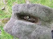 Indentation carved into the top of the bilateral figure, often used as a location for small mementos such as coins