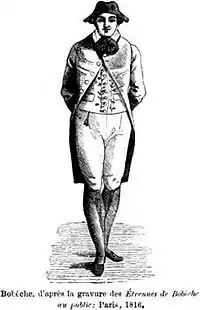 Bobèche was a tall, thin and emaciated boy, who played the standard comedic role of Jocrisse. Performing on trestle stages on the Boulevard du Temple, he wore a costume in the Lower Normandy style, consisting of yellow breeches, patterned stockings, a red jacket, straw-coloured wig, and a small horned hat adorned with a butterfly. One chronicler wrote: "Bobèche was original, blending Janot and Jocrisse, these two excellent creations of Volanges at Brunet. His face was distinguished, his manner shy, but this sardonic shyness reveals what is called a vacuous person from Sologne, which is to say a cunning chap, wily and meek. I can still picture his half-closed eye, his caustic smile, his lower lip raised to give his appearance an astonished, candid appearance. He was a comedian in this great red coat, and under that grey, horned hat, decked out with a butterfly!".