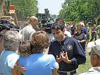 Jindal oversaw one of the largest evacuations in U.S. history (nearly two million people) in late August 2008 prior to the Louisiana landfall of Hurricane Gustav.[68] He issued mandatory evacuation orders for the state's coastal areas and activated 3,000 National Guardsman to aid in the exodus. He also ordered the state to purchase generators to provide needed power to hospitals and nursing homes without power. Government officials vacated hospitals and nursing homes and put the poor, the ill, and the elderly on buses and trains out of town. The evacuation was credited as one reason that Gustav resulted in only 16 deaths in the U.S. The state's successful response to Hurricane Gustav was in stark contrast to the failed hurricane response system for Hurricane Katrina in 2005. Jindal received bipartisan praise for his leadership during Gustav.[69][70] Jindal had been scheduled to address the Republican National Convention, but cancelled his plans in order to focus on Louisiana's needs during the storm.[71]