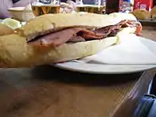 The bocadillo or bocata, in Spain, is a sandwich made with Spanish bread, usually a baguette or similar type of bread, cut lengthwise. Traditionally seen as a humble food, its low cost has allowed it to evolve over time into an iconic piece of cuisine. In Spain, they are often eaten in cafes and tapas bars.[1]