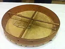 The bodhrán is one of the most basic of drums and as such it is similar to the frame drums distributed widely across northern Africa from the Middle East, and has cognates in instruments used for Arabic music and the musical traditions of the Mediterranean region (see Music of North Africa, Music of Greece etc.).[8] A larger form is found in the Iranian daf, which is played with the fingers in an upright position, without a stick. Traditional skin drums made by some Native Americans are very close in design to the bodhrán as well.[7]