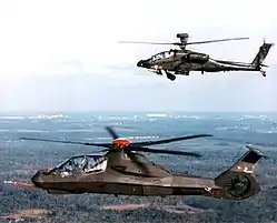 During 1982, the U.S. Army initiated the Light Helicopter Experimental (LHX) program with the aim of producing a replacement for several existing rotorcraft, including the UH-1, AH-1, OH-6, and OH-58 helicopters. It was a further six years until, in 1988, a formal request for proposal (RFP) was issued to various manufacturers, in time which the requirement had evolved into a battlefield reconnaissance helicopter.[1][2] In October 1988, the Army announced two teams, these being Boeing–Sikorsky and Bell–McDonnell Douglas, received contracts to further develop their concepts.[3] During the 1990s, the program's name was changed from LHX to simply Light Helicopter (LH).[4] In April 1991, the Army awarded the Boeing–Sikorsky team a $2.8 billion contract to complete six prototypes.[5] Later that month the helicopter received its official designation of RAH-66 Comanche.[4]