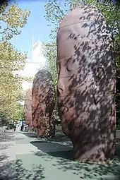 The city describes Domenge's sculptures as unifying perceived opposites and harmonizing apparent dissonances by geometrically referencing the natural world.[25] The four piece installation includes a 16-foot (4.9 m) tall red-painted bronze sculpture, Tree of Life on the North Boeing Gallery, which stands as the tallest of work in the exhibit with its 4 feet (1.2 m) wide and 9 feet (2.7 m) tall pair of companion seeds. The tree and seed's represent life in it full form and its new emergence.[30] They are said to represent the "Circle of life".[27] The South Boeing Gallery hosts three steel spheres: Tabachin Ribbon, a 13-foot (4.0 m) tall yellow sculpture; Wind Waves, a white sculpture measuring approximately 16 feet (4.9 m) high and Coral, in blue, approximately 10-foot (3.0 m) high. Domenge's spheres defy gravity and space, conveying a rhythmic beauty and a sense of a larger universal order.[30] The Boeing installation's spheres are said to express a type of beauty that pays respect to a larger universal order with reference to biological examples.[25] The installation on the Boeing Galleries places the works above and to the east of Wrigley Square (North Gallery) and Crown Fountain (South Gallery).[31] Domenge stated that she attempts to express the beauty of natures geometric order that it expresses in the molecular structures of flowers and plants. She feels that the spheres on exhibit in the South gallery depict the geometric perfection of the cosmos and that the celebrate this in a "festival of color and form".[26] In keeping with her belief in the harmony of nature and out of respect for the park, she presented an installation that required no welding or screws.[28]