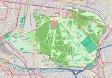 The Bois de Vincennes has a total area of 995 hectares[2] (2,459 acres), making it slightly larger than the Bois de Boulogne, (846 hectares / 2,091 acres), the other great Parisian landscape park located at the western side of the city.[3] It occupies ten percent of the total area of Paris, and is almost as large as the first six arrondissements in the center of the city combined. The Bois de Vincennes is about three times larger than Central Park in New York City (341 hectares / 843 acres), and is slightly larger than Richmond Park in London (955 hectares / 2,360 acres); but is smaller than Griffith Park in Los Angeles (1,170 hectares / 2891 acres). Only about half of the Bois de Vincennes is covered with trees.