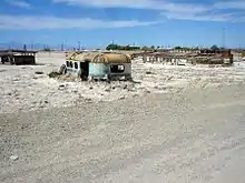 Bombay Beach is located in Southern California's Sonoran Desert.[19] Bombay Beach is located on the east shore of the Salton Sea and, like many communities along its shores, has had to contend with fluctuating water levels, reducing size of the lake and increasing salinity. A berm was built in the 1970s to protect the west end of the town, but a portion of the town beyond the berm was either submerged or half-buried in mud.[20][21][22]