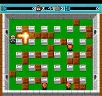 The single player game is divided into eight worlds, each one divided into eight stages.[1][2] Each stage is presented as a maze of blocks filled with enemies. By using bombs, the player must destroy the blocks blocking their path and defeat all of the enemies. Once all of the enemies are defeated and the hidden exit is uncovered, the player can proceed to the next stage. Each stage also includes one power-up hidden under one of the blocks, which can increase the number of bombs drops, increase the range of the bombs' explosions, and other useful powers. The eighth stage in each world is a boss battle.