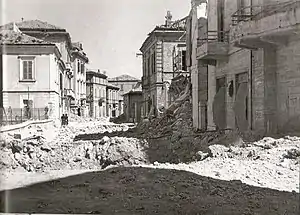 By the time the Allies entered Pescara, on 10 June 1944, 78 % of all buildings had been destroyed or damaged (1,265 buildings had been destroyed, 1,335 had been badly damaged, and 2,150 had been lightly damaged); of a population of 54,000 people, between 2,000 and 6,000 had been killed, and 12,000 were left homeless. The part of the town located north of the Pescara river was completely destroyed.[1][2]