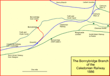 The North British Railway took over the E&GR in 1865, and in May 1870 it opened a Bonnybridge station on the E&GR main line.[3][4] This was of course somewhat remote from the town, and on the other side of the canal; access to cross the canal was by the so-called Radical Pend, and constricted tunnel under the canal which carried a watercourse to the Bonny Water. Fireclay and brick works developed in the area of the station itself.