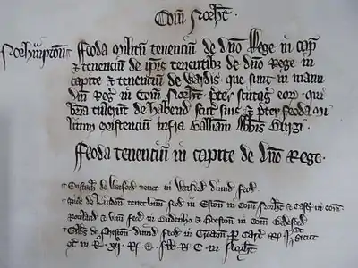 - The second collection consisted of two or more rolls of parchment, one of which is still extant, headed by the title Serjantie arentate per Robertum Passelewe tempore Regis H. filii Regis Johannis, meaning "Concerning the serjeanties let by Robert Passelewe in the time of King Henry III, son of King John".[5] It reports on the inquiries and their subsequent proceedings when Passelewe, a royal clerk and Bishop of Chichester, let (i.e. rented out, the technical term is "arrented") a number of lands held by the feudal land tenure of serjeanty. The text is accompanied by passages quoted from several documents which are also contained within the Testa de Nevill. Added to this are the returns for several counties in answer to an inquiry made in 1255.[5]