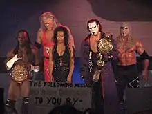 By mid-1999, Booker had convinced his brother, Stevie Ray, to leave the nWo and reunite Harlem Heat.[23] Harlem Heat defeated Bam Bam Bigelow and Kanyon for the WCW World Tag Team titles at Road Wild.[32] They lost the WCW World Tag Team titles to Barry and Kendall Windham on August 23,[33] but Harlem Heat regained them about a month later at Fall Brawl.[34] When The Filthy Animals were stripped of the WCW World Tag Team belts due to an injury suffered by Rey Mysterio Jr., the title was put up in a three-way dance at Halloween Havoc. Harlem Heat claimed their tenth WCW World Tag Team title defeating Hugh Morrus and Brian Knobs and Konnan and Kidman.[34] By late 1999, a female bodybuilder named Midnight had joined Harlem Heat. Stevie neglected her help and started disputing with Booker over her.
