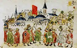 The pilgrims going to St. Peter's and coming from the left bank through Ponte Sant'Angelo, after entering a gate (later named Porta Castello) could walk through the Borgo of the Saxons (today's Borgo S. Spirito) or the Porticus or Portica (named now Porticus Sancti Petri), which was still in place.[13] Those coming from Trastevere along the route that would later become Via della Lungara used the posterula Saxonum (today's Porta Santo Spirito),[14] and, finally, the pilgrims coming from the north (monte Mario) following the Via Francigena, entered through Porta San Pellegrino (also named Viridaria because of its vicinity to the Vatican Gardens).
