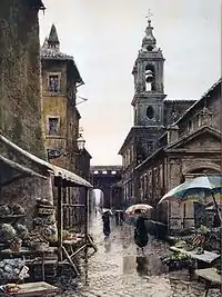 Many sellers of religious goods, named Paternostrari or Coronari (rosary makers) had their shops here. At the edge of the quarter, in Vicolo degli ombrellari, a small lane near Borgo Pio, were the shops of the Roman umbrella makers, gathered there because of the bad smell coming from the oiled silk. In Borgo Vecchio several small foundries were active, where artistic objects made of bronze were cast. Particularly characteristic was the making of bells: the last foundry, located in Vicolo del Farinone, closed around 1995, after an activity lasted about 450 years.[31] In the Borgo were also located many famous osterie, where Romans and pilgrims could eat and drink wine.[32]