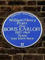 Karloff was born William Henry Pratt on 23 November 1887,[3] at 36 Forest Hill Road, Dulwich, Surrey (now London), England.[4] His parents were Edward John Pratt, Jr. and Eliza Sarah Millard. His brother, Sir John Thomas Pratt, was a British diplomat.[5] Edward John Pratt, Jr. was an Anglo-Indian, from a British father and Indian mother,[6] while Karloff's mother also had some Indian ancestry, thus Karloff had a relatively dark complexion that differed from his peers at the time.[7] His mother's maternal aunt was Anna Leonowens, whose tales about life in the royal court of Siam (now Thailand) were the basis of the musical The King and I. Pratt was bow-legged, had a lisp, and stuttered as a young boy.[8] He learned how to manage his stutter, but not his lisp, which was noticeable throughout his career in the film industry.