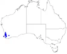 This boronia grows on laterite and granite in stony soils. It is found on the Darling Scarp between Dwellingup and Wannamal in the Jarrah Forest and Swan Coastal Plain biogeographic regions.[3][2]